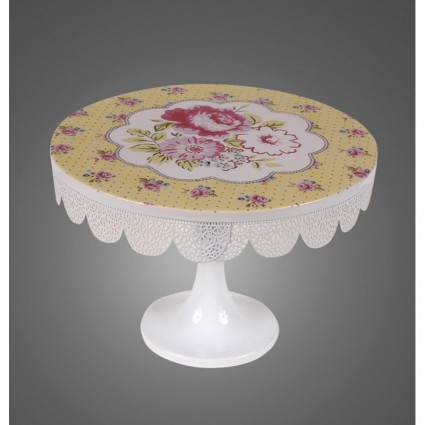 Plato de metal con pie redondo. Color: amarillo con diseño. Medidas: 25 cm. diámetro por 18 cm. de altura.
