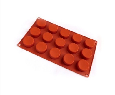 Molde de silicona círculos por 15 unidades. Medida del molde: 16 cm. por 28 cm. Medida de cada círculo 3,5 cm. de diámetro por 2 cm. de profundidad.