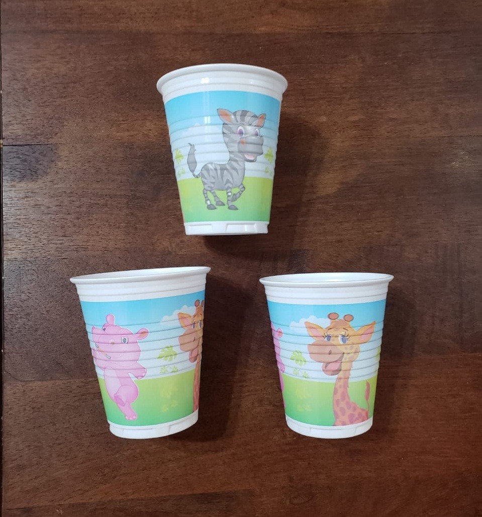 Vaso con diseño de “Selva”. Material: plástico. Medidas: 8 cm. de alto por 7 cm. de diámetro. Son ideales para las mesas de un cumpleaños o festejo infantil. Pueden combinarse con otros productos de la línea de “Selva”.